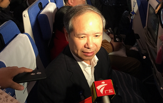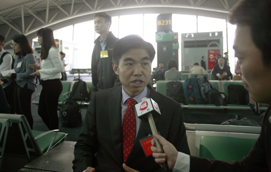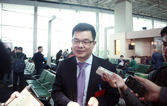 十三届全国人大一次会议将于3月5日在北京开幕。3月2日下午,132名在粤全国人大代表集体乘机从广州出发,前往北京参会。图为全国人大代表肖胜方在机场候机区接受媒体采访